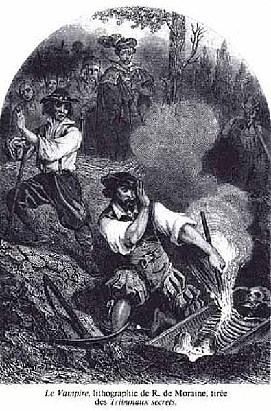 A lithography from 1864 showing people burning the alleged corpse of a vampire.