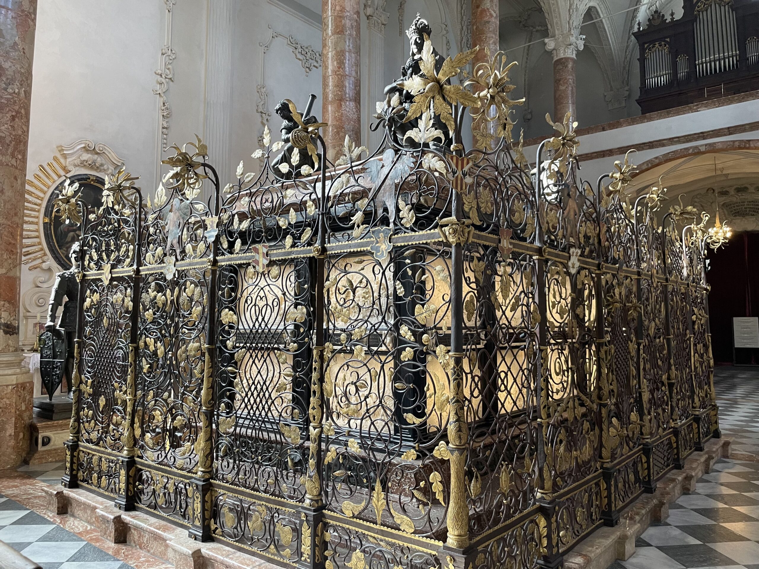 I started from the eighteenth-century Triumphal Arch, I walked past the large Liberation Monument and then I reached Maria-Theresien-Straße, an important and central street with many decorated buildings and featuring Saint Anne’s Column, one of the most famous landmarks in Innsbruck. Next, I visited the Tyrolean Folk Art Museum and the adjacent Hofkirche (Court Church), a sixteenth-century church hosting the elaborate cenotaph of Emperor Maximilian I. I passed by the cathedral, which was unfortunately closed, and the Innbrücke, a bridge on the river Inn with a view on the colorful riverside houses and the mountains surrounding the city, before finally heading to the heart of the old town, where the symbol of Innsbruck, the Goldenes Dachl, is located. This is a Gothic balcony adorned with thousands of copper tiles overlooking the main square of the old town.