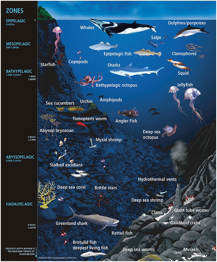 Illustrazione della vita animale che si può trovare nei diversi strati oceanici (Amy Apprill, Wikimedia Commons, CC BY-SA 4.0).
